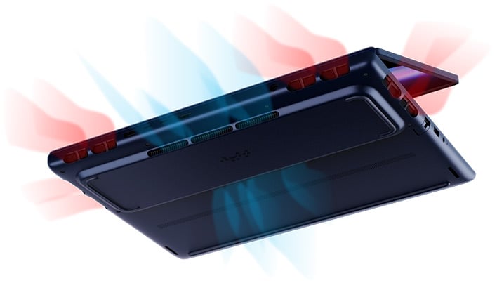 Once we have the bottom off, we can see a pair of fans blowing across two fin arrays on the rear. Since the hinge folds up above the system, we don't have any heat escaping between the chassis and the display; it's all directly out the rear. This is definitely the superior design because the heat isn't trapped between the user and the screen. Instead it can waft away freely from the rear. At the top we can see two of the quad speakers, which fire down next to the 96 Watt-hour battery.