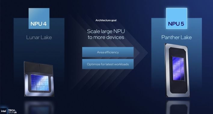 The neural processing unit in Panther Lake is dubbed NPU 5. In terms of its peak TOPS versus NPU 4 in Lunar Lake, it doesn’t seem like a massive upgrade. NPU 5 will offer up to 50 TOPS, versus NPU 4’s (Lunar Lake's) 45 TOPs. NPU 5, however, is optimized for efficiency and has been re-tuned to better handle the latest workloads.